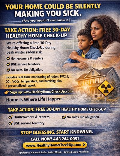 January Is National Radon Action Month. Indoor air can be up to 100x more polluted than outdoor air, yet most homes go untested for radon, asthma triggers, and other harmful pollutants. Your home shouldn’t make you sick—but many do.